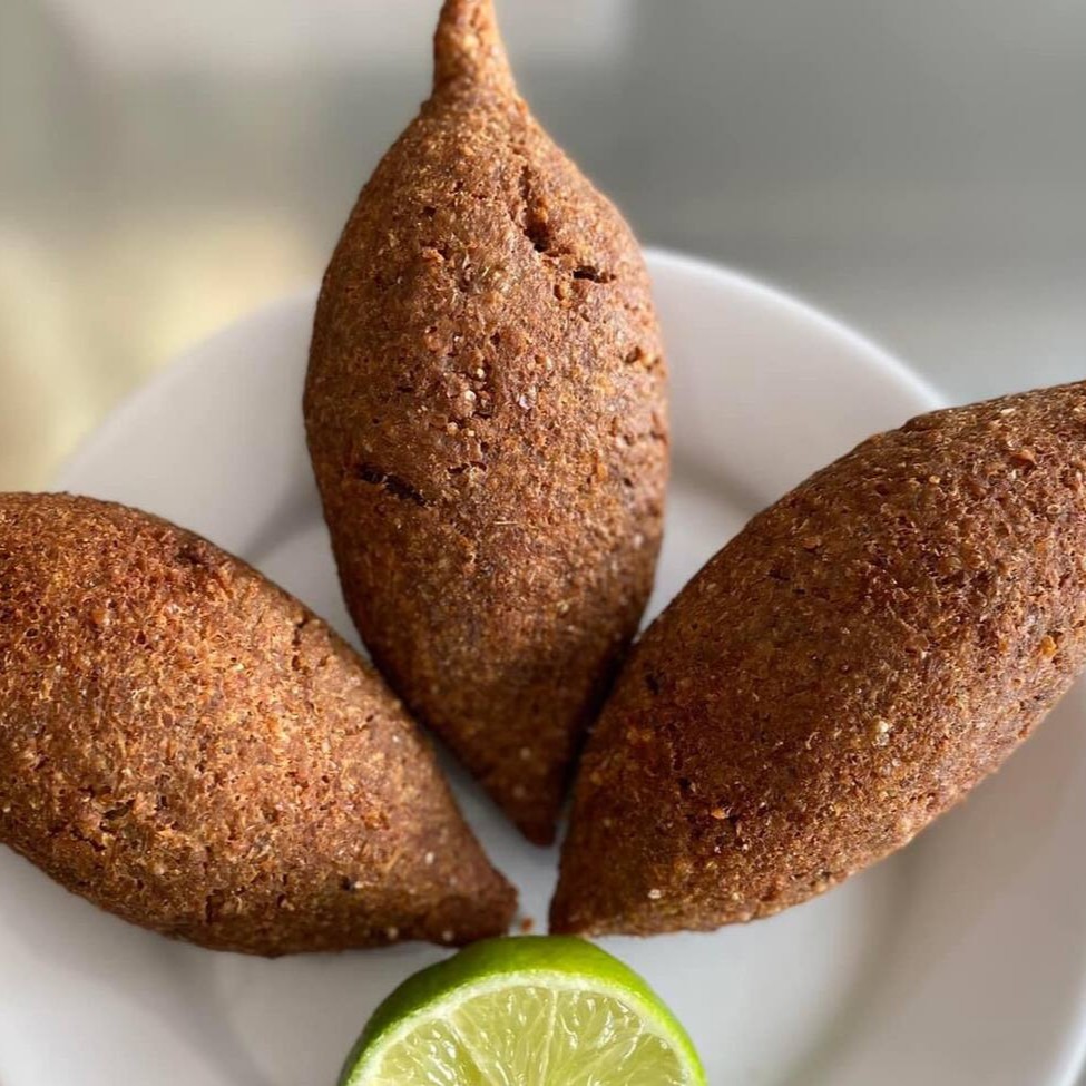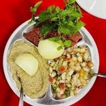 Trio com kibe cru , babaganush e tabule. Acompanha pão sírio.