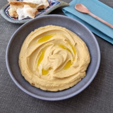 Pasta de grão de bico temperada com molho sírio.