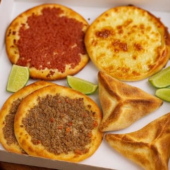 Duas esfihas canoa recheadas com carne temperada e duas esfihas com mussarela derretida, assadas na hora. Combinação perfeita de sabores clássicos em um combo delicioso! (aprox.440)