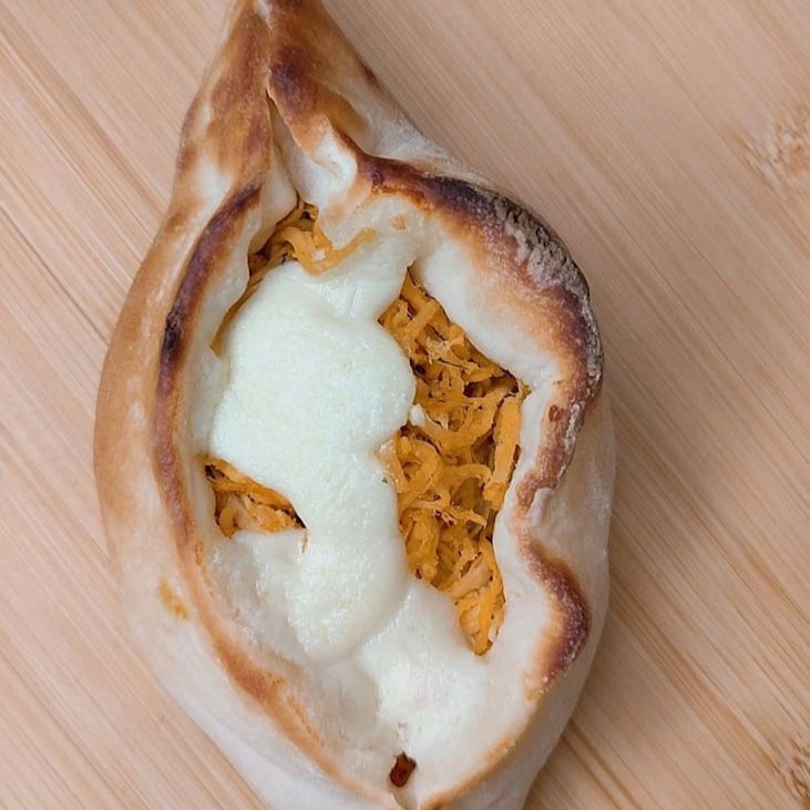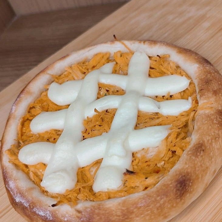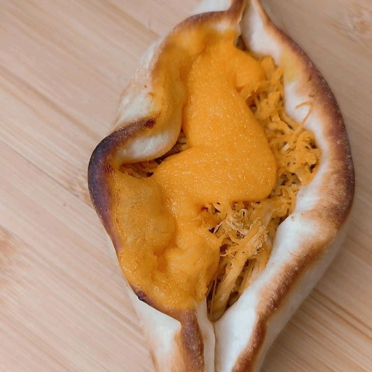 Esfiha canoa com frango desfiado e bem temperado, coberta com cheddar cremoso sobre massa fina e assada na hora. Uma combinação intensa e irresistível. (Aprox. 120g)