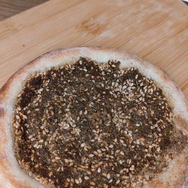 Esfiha com zaatar temperado no azeite, sobre massa assada e macia. Sabor típico do Oriente Médio com toque aromático e levemente cítrico. (Aprox. 100g)