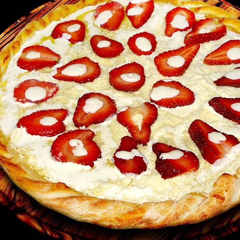 Chocolate branco, morango em calda e leite condensado