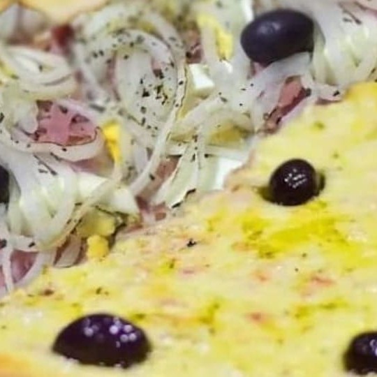 metade calabresa e cebola metade portuguesa presunto,ovos,ervilha,cebola,cobertura de mussarela