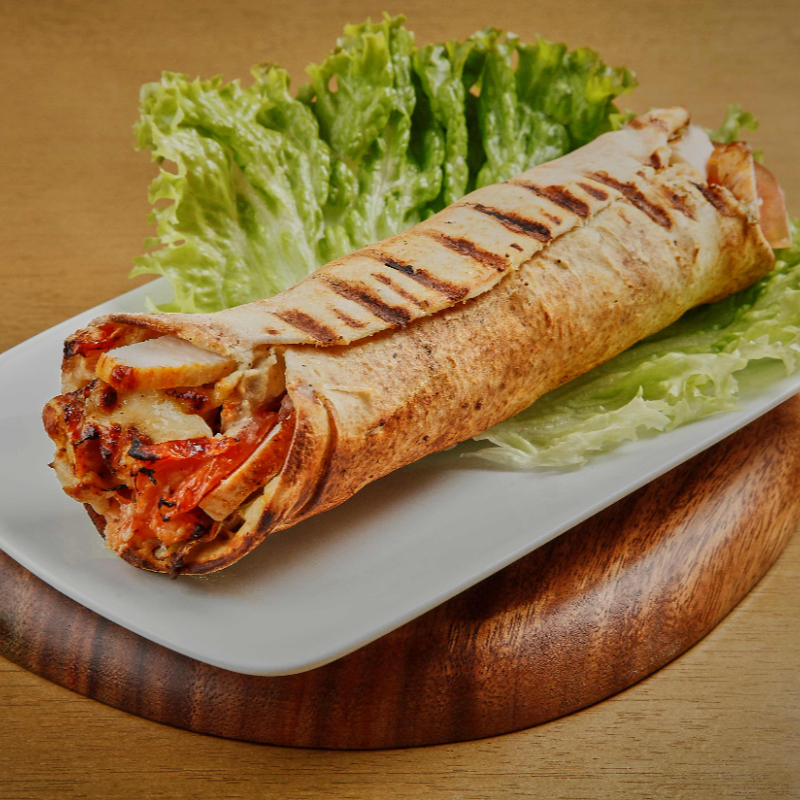 Frango Suculento com queijo mussarela , enrolado em um pão crocante , com o toque cremoso do Homus caseiro e nosso Molho Secreto. Acompanhados pelo toque de frescor da alface , cebola , pimentão e tomate