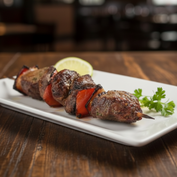 Tenros Cubos de Filé Mignon intercalados com Cebola e Pimentão