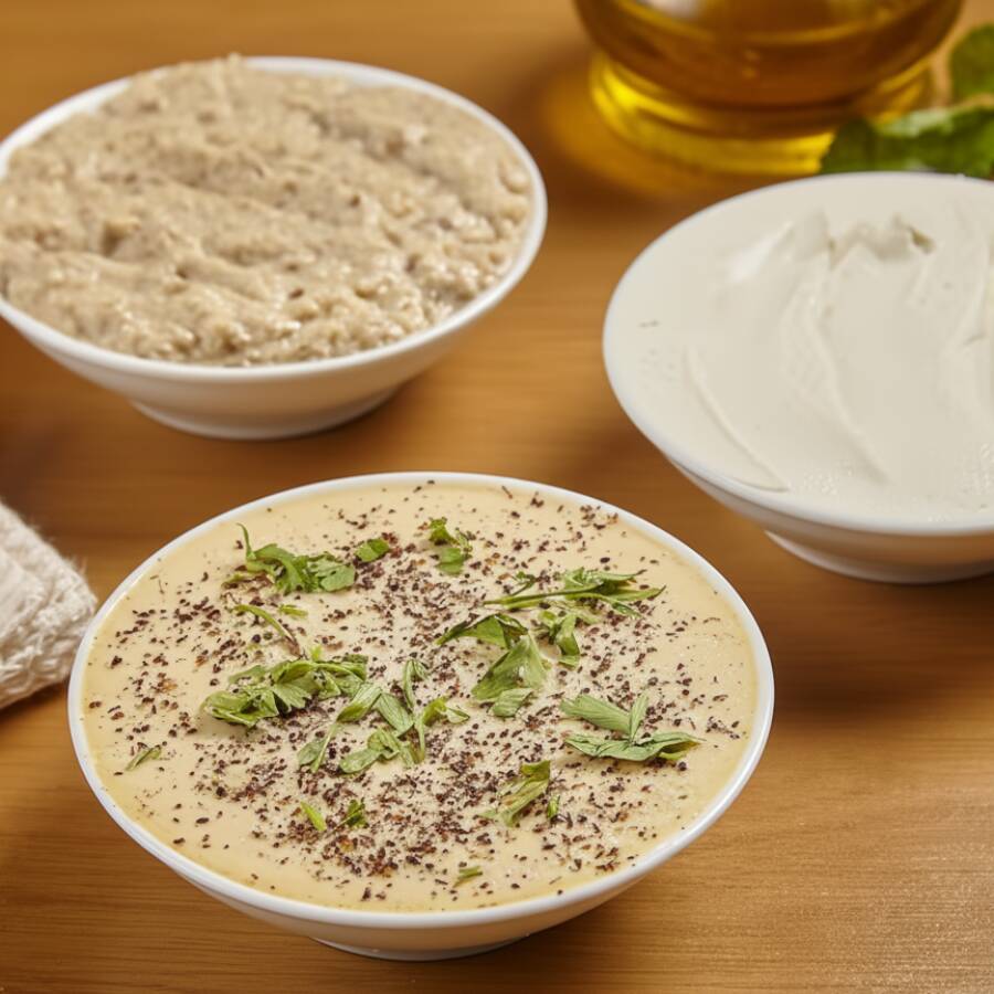 Sopa de Coalhada: Trigo Inteiro, Grão de Bico, Bolinhas de Kibe Recheadas, Hortelã Seca, Alho Frito e Limão. Sopa Madah: Trigo Grosso, Cebola, Manteiga e Carne Desfiada.