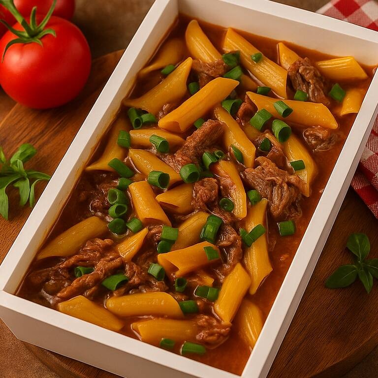 Saboreie um penne macio envolvido em um molho de tomate caseiro, com pedaços generosos de carne louca desfiada e temperada lentamente. A marmita vem selada com 500g de puro sabor e suculência, mantendo todo o frescor até chegar a você. Peça agora e sinta o sabor da comida feita com capricho!