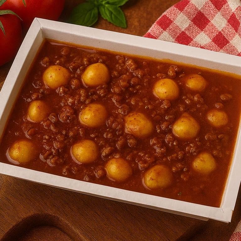 Nhoque macio e delicado, preparado no ponto perfeito, envolvido em um molho à bolonhesa encorpado, feito com carne bem refogada, tomate selecionado e temperos que trazem aquele sabor clássico e irresistível. Acompanha queijo parmesão ralado à parte, para finalizar do seu jeito e elevar ainda mais a experiência. Uma refeição confortante, farta e extremamente saborosa, perfeita para quem ama massas bem servidas e cheias de personalidade. 🔥 Clássico italiano que conquista no primeiro garfo ⚖️ Aproximadamente 500g de uma refeição completa 🧀 Parmesão à parte para finalizar com ainda mais sabor
