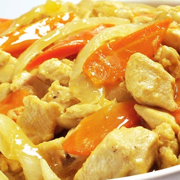 Peito de frango fatiado com cenoura, cebola ao molho curry.