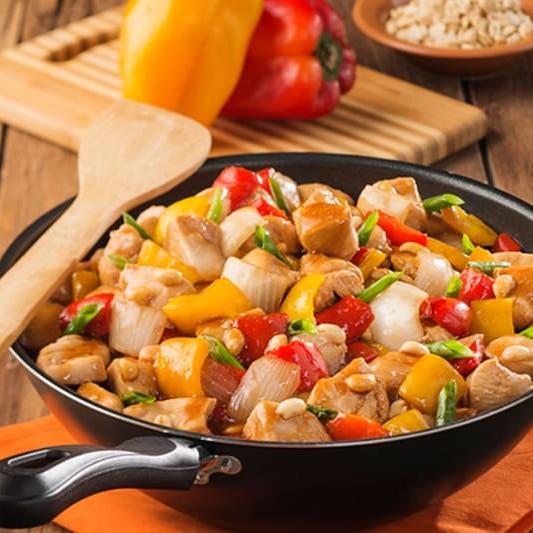 Cubos de peito de frango com pimentão, cebola, cenoura, salsão, camarão, champignon ao molho shoyu e amendoim
