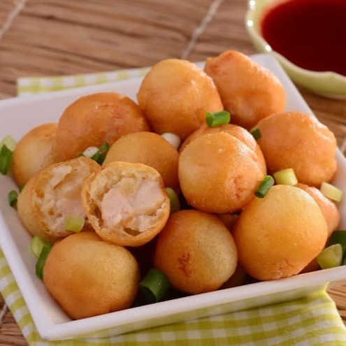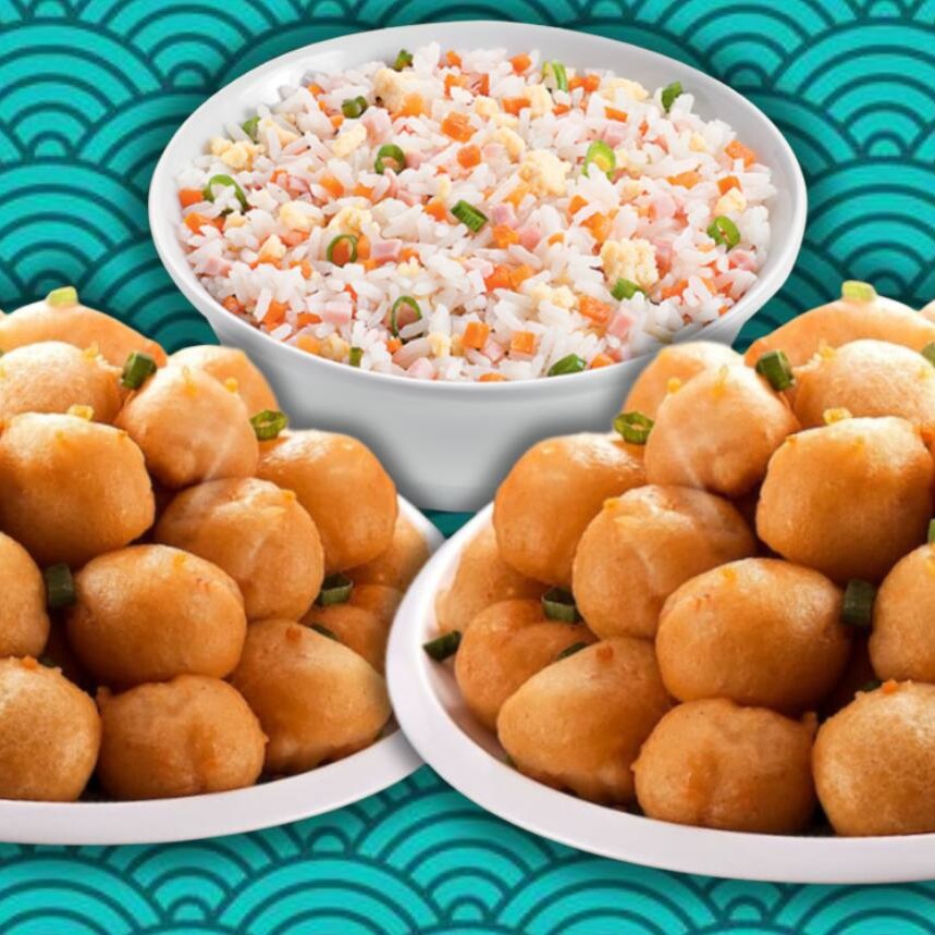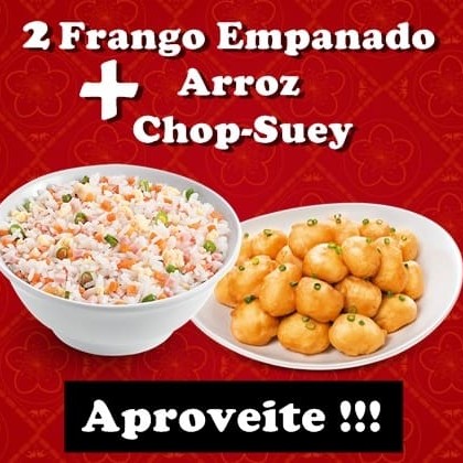 (02 Unidades no tamanho Pequeno, cada unidade serve 1 Pessoa) 1/2 Porção pequena de pedaços de frango em cubos envolvido em massa leve e frito. + 1/2 porção pequena de Arroz Chop-Suey.