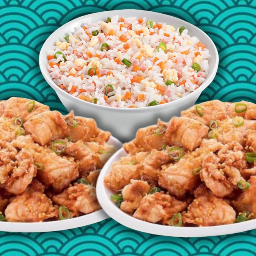 (02 Unidades no tamanho exg grande, cada unidade serve 1 Pessoa) 1/2 Porção grande de Pedaços de frango desossados e fritos, salpicados com cebolinha.+ 1/2 porção grande de Arroz Chop-Suey.