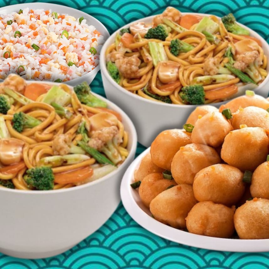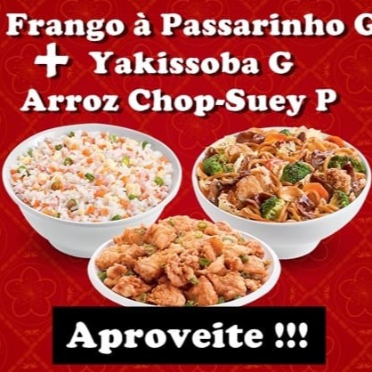 Promoção Irresistível Serve de 2 a 3 Pessoas Yakissoba Tradicional: Saboroso macarrão chinês com carne, frango e legumes selecionados ao molho shoyu. Frango à Passarinho: Deliciosos Pedaços de frango desossados e fritos, salpicados com cebolinha. Risoto De Presunto: Tradicional risoto chinês com ovo, cenoura, presunto e cebolinha.