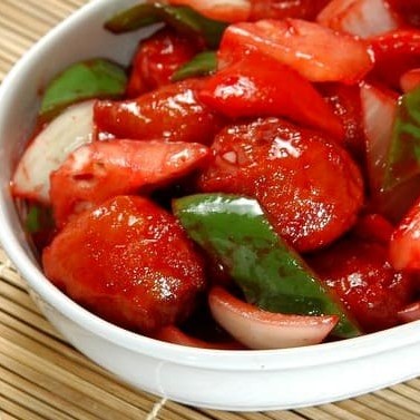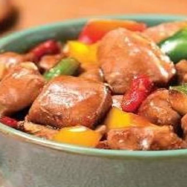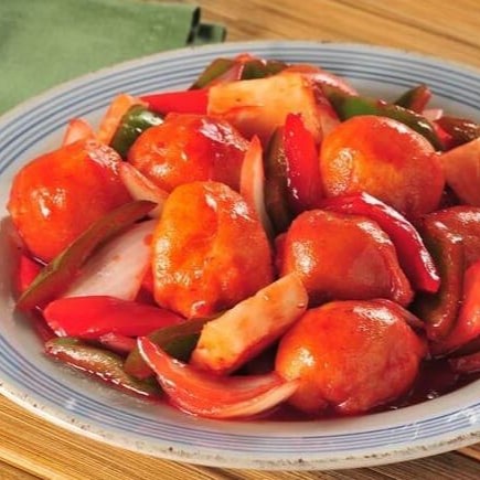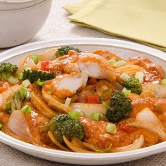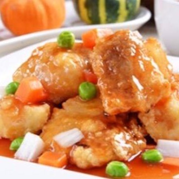 Cubos de peito de frango empanados ao molho agridoce com abacaxi, cebola e pimentão.