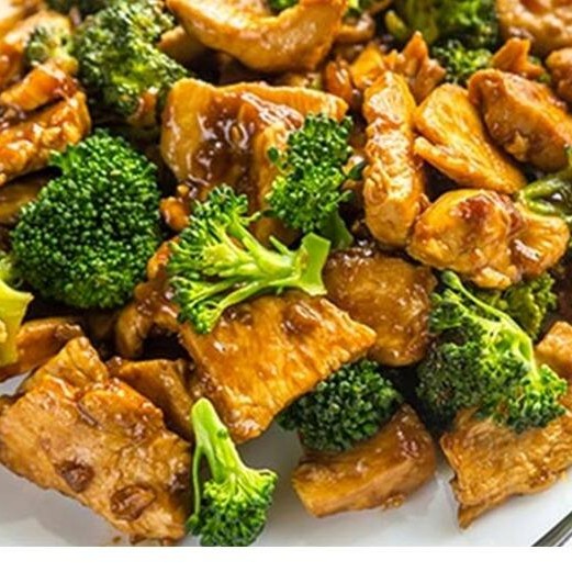 Peito de frango fatiado com brócolis e champignon ao Molho Shoyu.