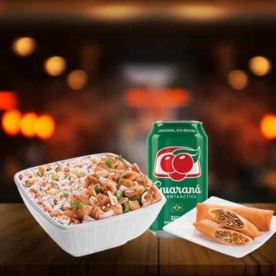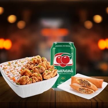 Combinação Irresistível Serve 1 Pessoa Deliciosos pedaços de frango desossados e fritos salpicados com cebolinha. Arroz Chop-Suey é o nosso tradicional arroz soltinho refogado com flocos de ovo, cubinhos de cenoura e cebolinha. Saboroso Rolinho Primavera Com massa fina crocante e sequinha. Refrigerante Lata Bem Gelado.