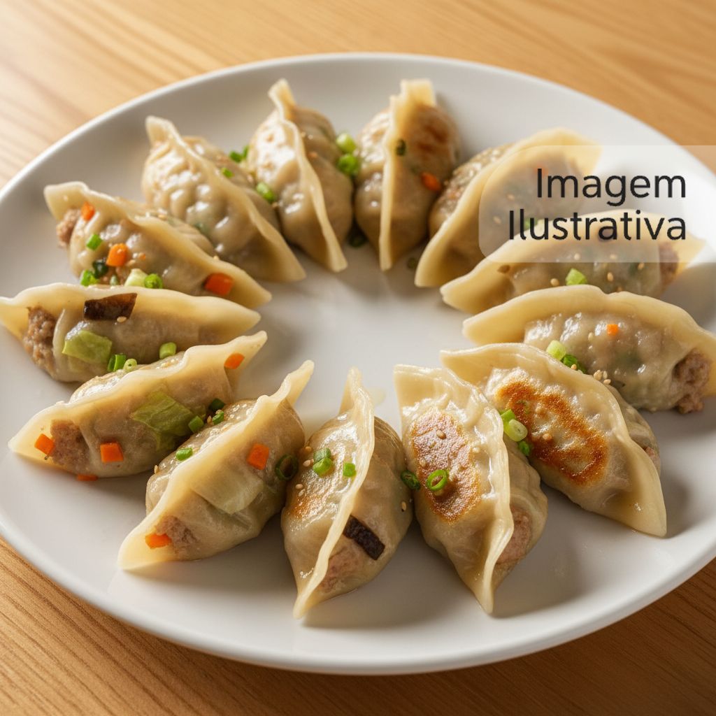 Pastéis recheados com carne de porco temperada e vegetais, cozidos no vapor e levemente grelhados.
