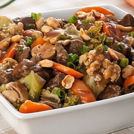 Filé bovino fatiado com legumes selecionados e champignon ao molho shoyu.