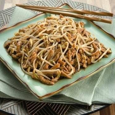 Filé bovino desfiado, com broto de feijão ao molho shoyu.