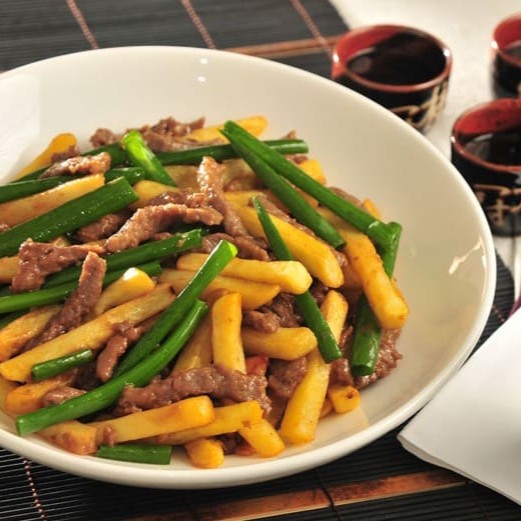 Deliciosos pedaços de carne bovina fatiada com batata frita salpicada com cebolinha ao molho shoyu.
