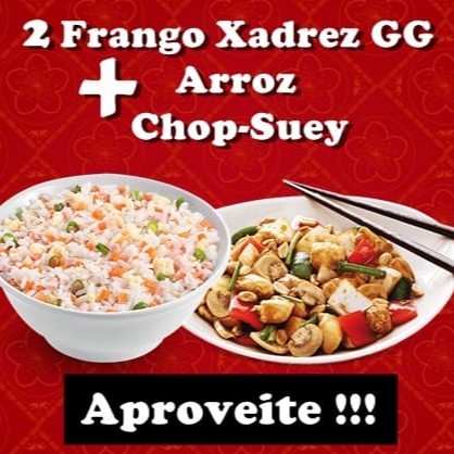 Promoção Irresistível Serve de 3 a 4 Pessoas Frango Xadrez: Deliciosos pedaços de Peito de frango com pimentão e cebola ao molho shoyu. Risoto De Presunto: Tradicional risoto chinês com ovo, cenoura, presunto e cebolinha.