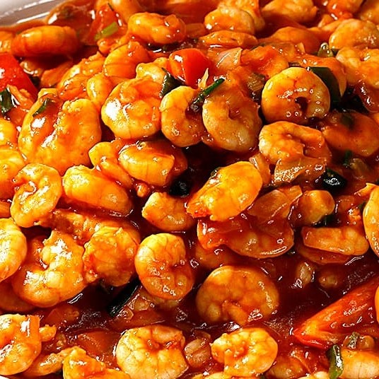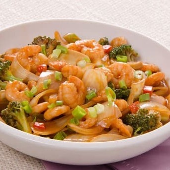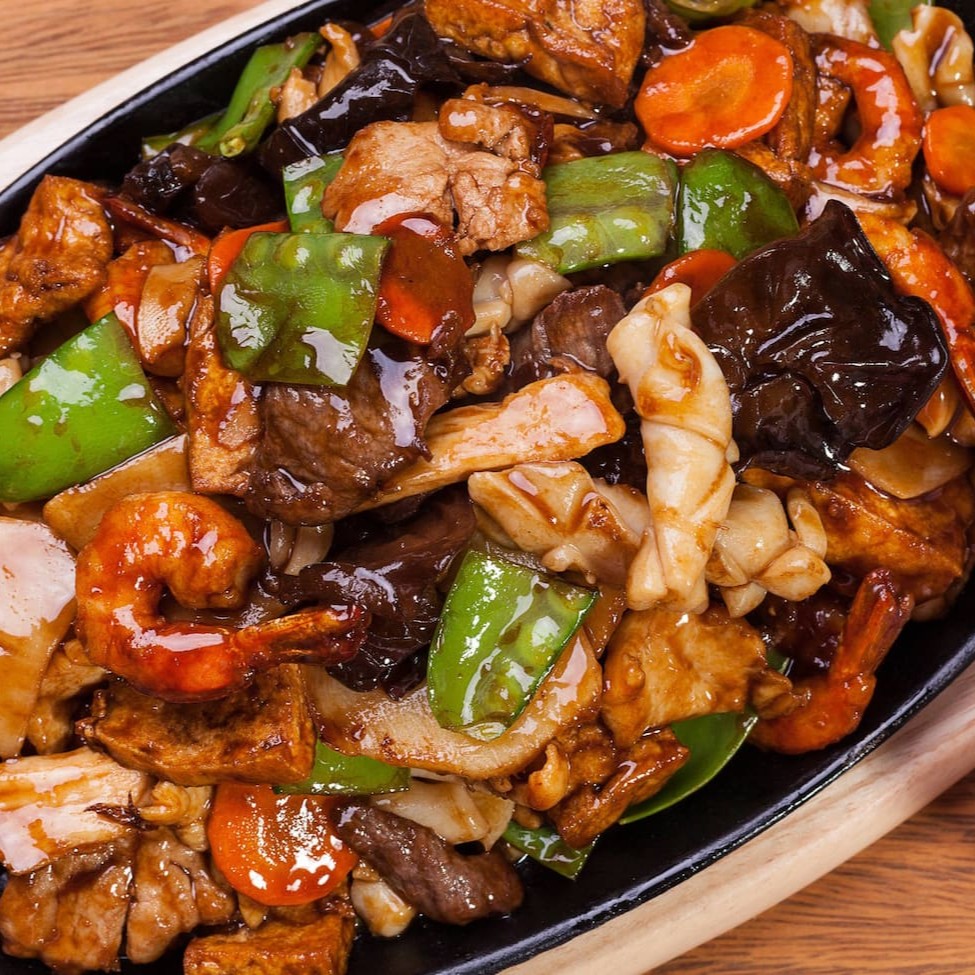 Cubos de lombo com pimentão, cebola, cenoura, salsão ,camarão, champignon ao molho shoyu e amendoim.