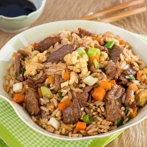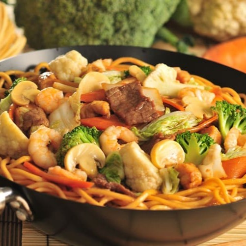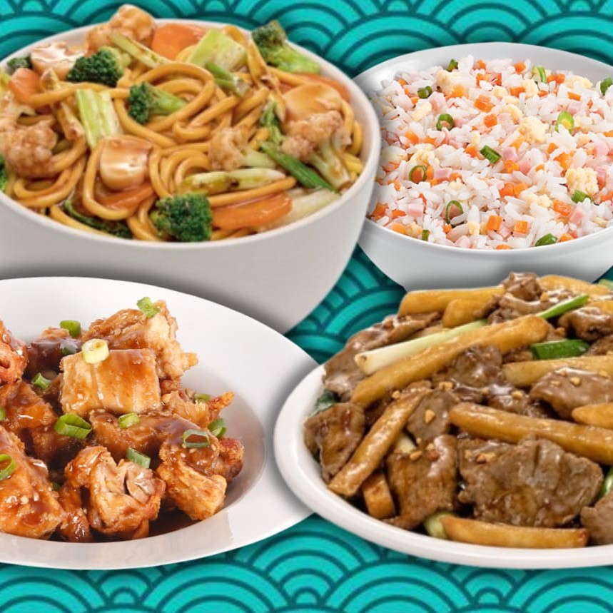 Saboroso macarrão chinês com carne, frango e legumes selecionados ao molho shoyu. Cubos peito de frango empanado e sequinhos, salpicados com cebolinha. Tradicional risoto chinês com cenoura, presunto, ovo e cebolinha picada.