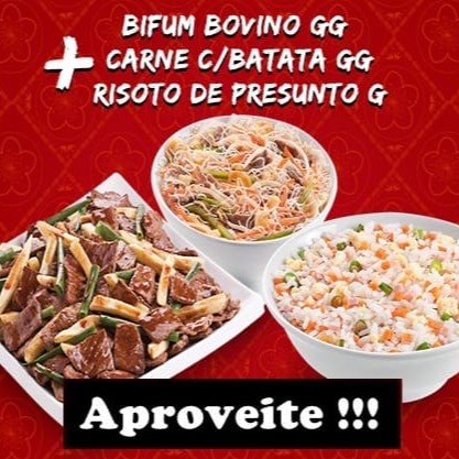 Combinado Irresistível Bifum: Macarrão de arroz com floquinhos de ovo, Carne Bovina e legumes selecionados. Carne Com Batata: Deliciosos pedaços de carne bovina fatiada com batata frita salpicada com cebolinha ao molho shoyu. Risoto De Presunto: Tradicional risoto chinês com ovo, cenoura, presunto e cebolinha.