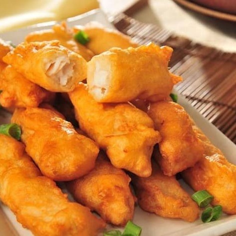 Filé de peixe empanado salpicado com cebolinha. Acompanha molho agridoce