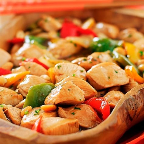 Cubos de peito de frango com pimentão, cebola, cenoura, salsão ao molho shoyu e amendoim