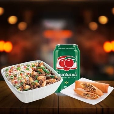 Combinação Irresistível Serve 1 Pessoa Deliciosos Pedaços de carne bovina fatiada com batata frita salpicada com cebolinha ao molho shoyu. Arroz Chop-Suey é o nosso tradicional arroz soltinho refogado com flocos de ovo, cubinhos de cenoura e cebolinha. Saboroso Rolinho Primavera Com massa fina crocante e sequinha. Refrigerante Lata Bem Gelado.
