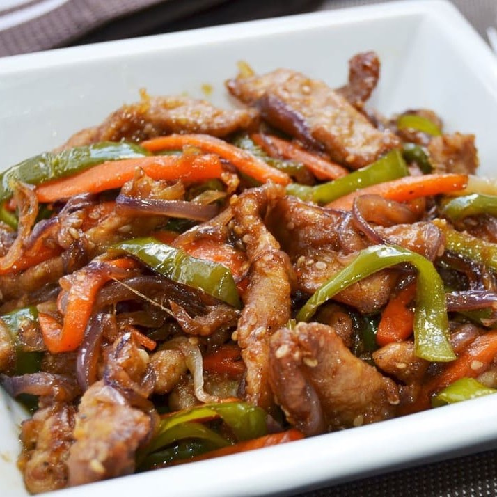 Cubos de lombo com pimentão, cebola, cenoura, salsão ao molho shoyu e amendoim.