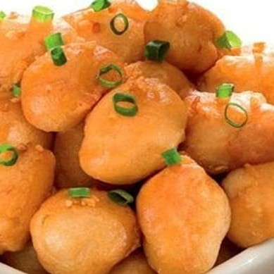 Cubos de salmão empanado, salpicados com cebolinha. Acompanha molho agridoce