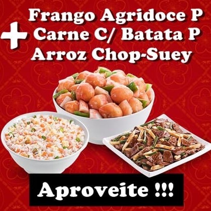 Promoção Irresistível Serve 2 Pessoas Frango Agridoce: Deliciosos cubos de Peito de frango empanados ao molho agridoce com abacaxi, cebola e pimentão. Carne Com Batata: Deliciosos pedaços de carne bovina fatiada com batata frita salpicada com cebolinha ao molho shoyu. Risoto De Presunto: Tradicional risoto chinês com ovo, cenoura, presunto e cebolinha.