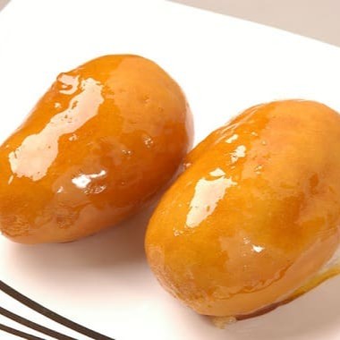 Fruta empanada e caramelada, salpicados com semente de gergelim.
