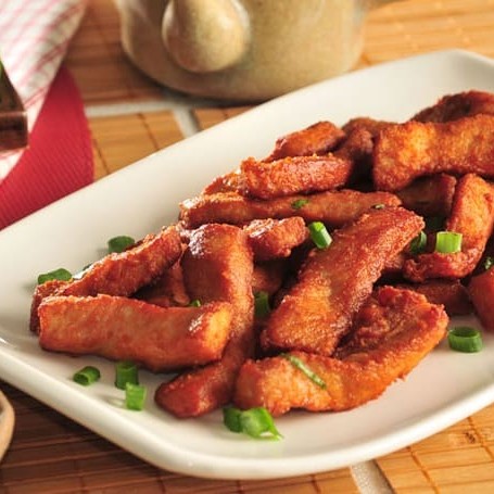Deliciosos pedaços de lombo em tiras frito, salpicados com cebolinha.