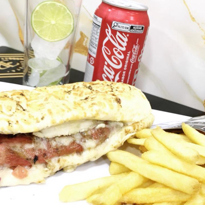 Lanche de linguiça no pão parmesão recheado com molho gourmet da casa, vinagrete e mussarela acompanhado de uma porção de batata pequena e refrigerante lata de sua preferência.