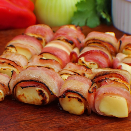 Suculentos cubos de carne bovina envoltos em tiras de bacon defumado. Crocância e sabor intenso em cada pedaço, uma união irresistível para os amantes de churrasco.