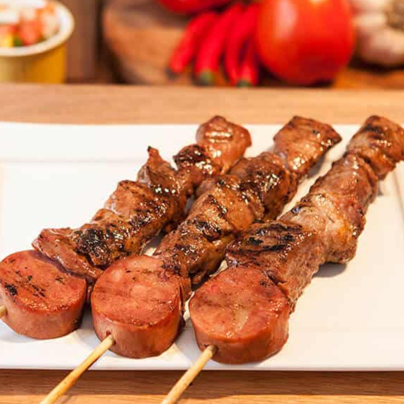 Mix perfeito de carnes (bovina, frango, linguiça), harmonizando diferentes sabores em um só espeto. Ideal para quem quer variedade.