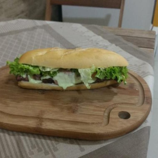 Pão briche ou sal, hambúrguer na brasa, queijo, alface, tomate, ketchup, mostarda e maionese e molho de alho