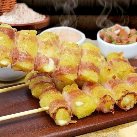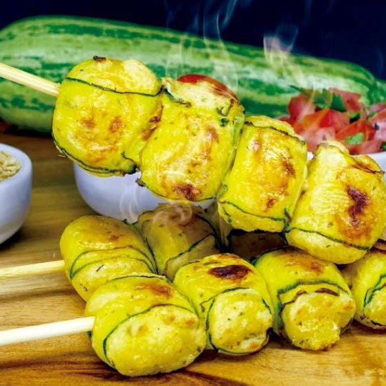 Delicioso espeto de mandioca recheado com queijo enrolado com abobrinha.