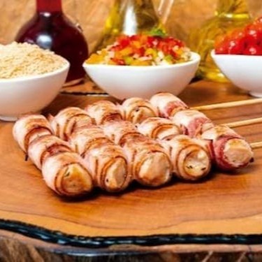 Carne temperada de suíno enrolada com bacon.