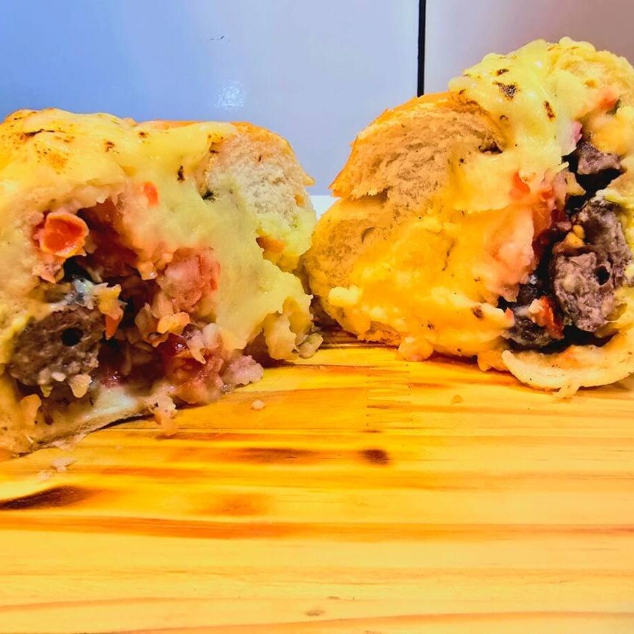 Pão Francês, Espeto de Carne, Vinagrete e Mussarela Derretida.