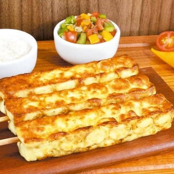 Escolha um Espeto. Pão Francês, Cream Cheese, Vinagrete , Purê de Batata e uma deliciosa Mussarela Derretida.