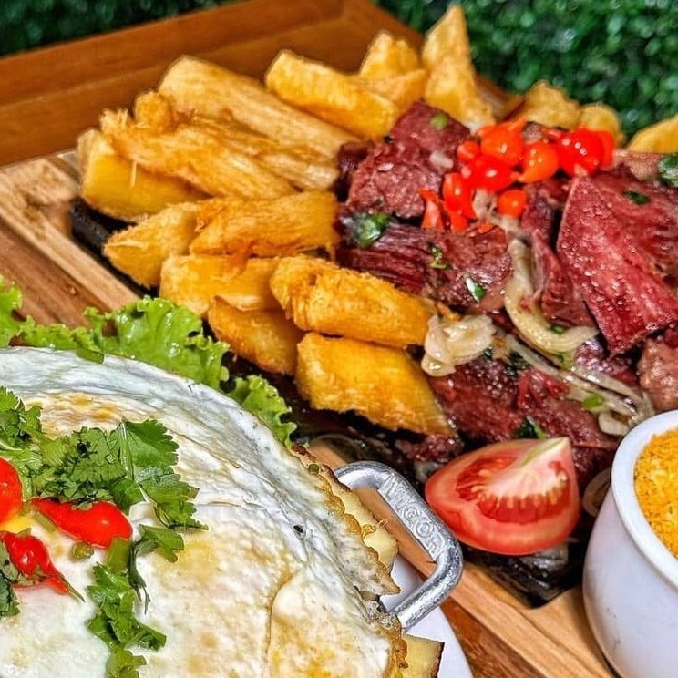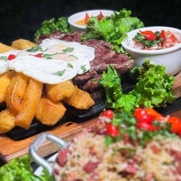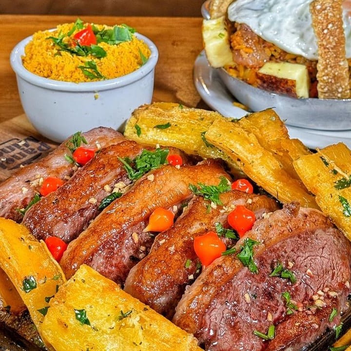 Contra filé c/ ovo, arroz carreteiro e mandioca frita _ _#Torresmo #Salgadinho #Picanha #porções #Filémignon #pratosespecias #Bacalhau #feijoada #carnes #caldos #saladas #panquecas #lanches #bebidas #delivery #