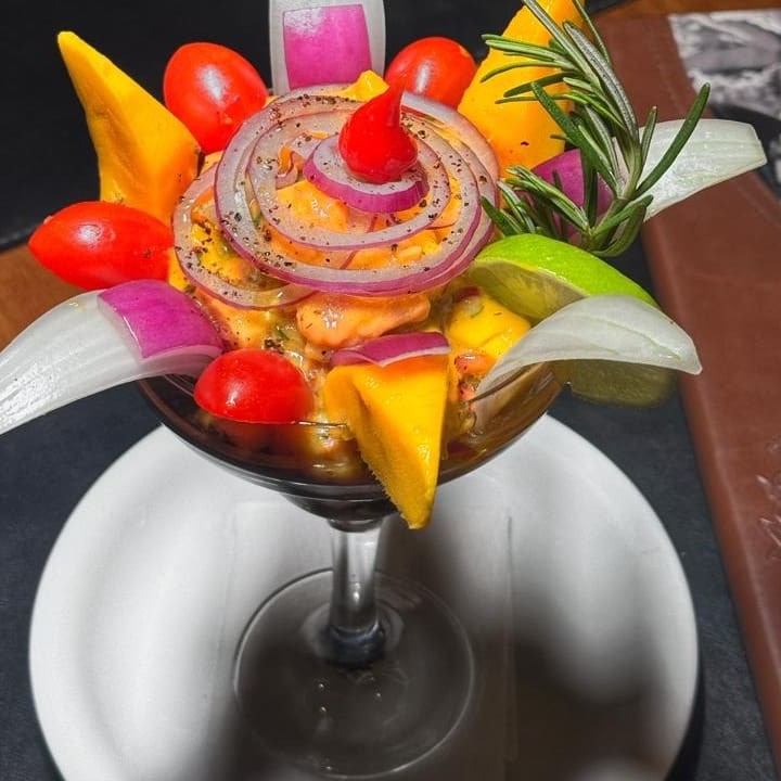 Salmão e manga em cubos, tomate cereja, cebola roxa à julienne e temperos _ _#Torresmo #Salgadinho #Picanha #porções #Filémignon #pratosespecias #Bacalhau #feijoada #carnes #caldos #saladas #panquecas #lanches #bebidas #delivery #