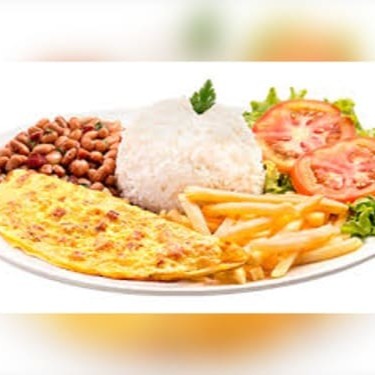 Arroz, feijão, fritas e ovo frito.