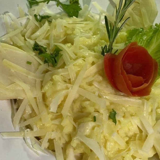 Cubos de palmito, arroz arbório, caldo de legumes e parmesão ralado _ _#Torresmo #Salgadinho #Picanha #porções #Filémignon #pratosespecias #Bacalhau #feijoada #carnes #caldos #saladas #panquecas #lanches #bebidas #delivery #