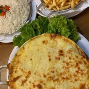 Arroz, fritas e picanha gratinada no molho de provolone e Catupiry. _ _#Torresmo #Salgadinho #Picanha #porções #Filémignon #pratosespecias #Bacalhau #feijoada #carnes #caldos #saladas #panquecas #lanches #bebidas #delivery #