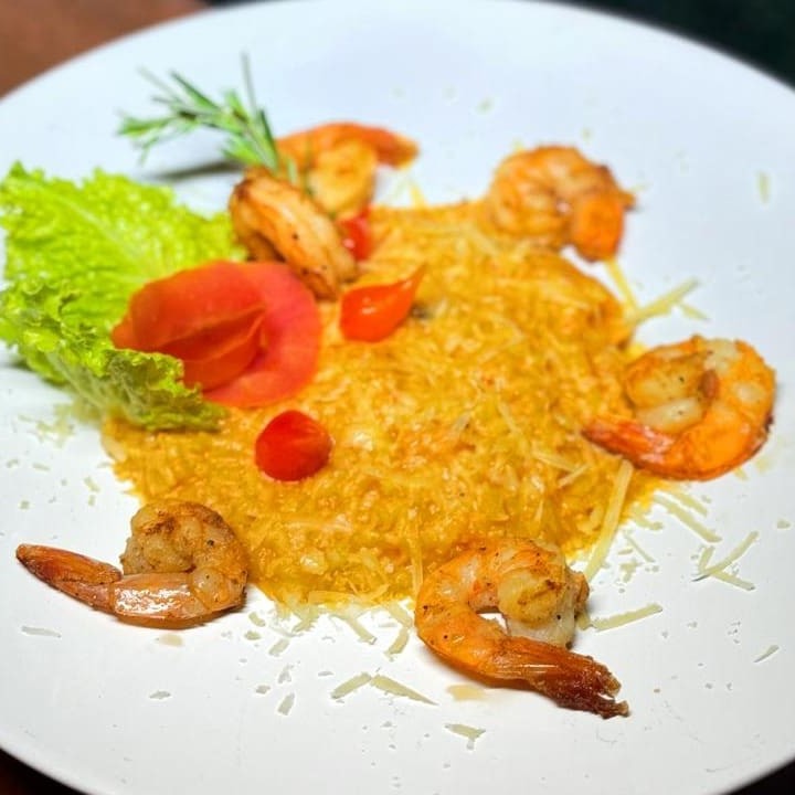 Arroz arbório, camarão no caldo de legumes e parmesão ralado _ _#Torresmo #Salgadinho #Picanha #porções #Filémignon #pratosespecias #Bacalhau #feijoada #carnes #caldos #saladas #panquecas #lanches #bebidas #delivery #